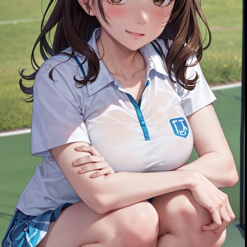 1 girl, solo, Hachimiya Meguru, hair ornament, light blue eyes, smile, open mouth, shirt, short sleeves, white shirt, yellow skirt, plaid skirt, looking at viewer, standing on one leg, pom pom (cheerleading), cheerleader, confetti, cowboy shot, outdoors, blue sky, day, sky, (intricate details:1.2), (masterpiece:1.2), (best quality:1.2), (very aesthetic:1.2), (absurdres:1.2), (detailed background), ray tracing, vibrant colors, depth of field, cinematic lighting, sharp focus, AddXL, hcmymgr, hcmymgr, long hair, blonde hair, low twintails, ahoge, bangs, hairclip, hair ribbon, blue eyes, score_9, score_8_up, score_7_up, source_anime