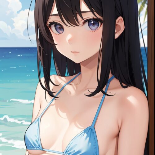 (((4K CG illustration))), (((masterpiece))), (((best quality))), ((ultra-detailed)), ((embarrassed face)), (smile:1.2), shiny skin, blush face, shaped pupils, (flat chest:1.4), (slingshot swimsuit:1.3), (areola slip:1.2), beach, squat, from below, more_details:-1, more_details:0, more_details:0.5, more_details:1, more_details:1.5, color one-piece swimsuit, slingshot swimsuit, Yuuki Mikan
