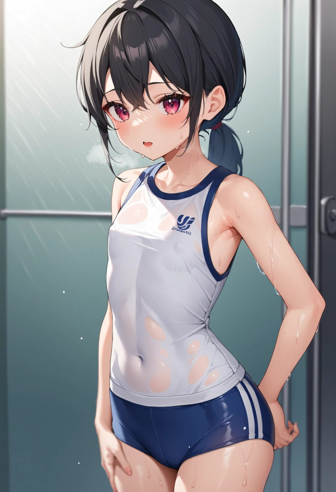 スコア_9, スコア_8_ アップ, スコア_7_ アップ, ソース_أنيمي,nsfw,固定されていない, (( 官能的で醜い :1.7)))、(ビッチガール:1.若い女の子とオラクル)、Low 体, 体,大きな顔の黒髪、ポニーテール、扁平胸、暗いシャワーの中で、(Doya face)、暴力的な動き、 ニップルアウトライン ,(:1.2), ((濡れた))、((クリスタルのように澄んだ青い学校の体操服:1.2)),白い蒸気,滴る水,